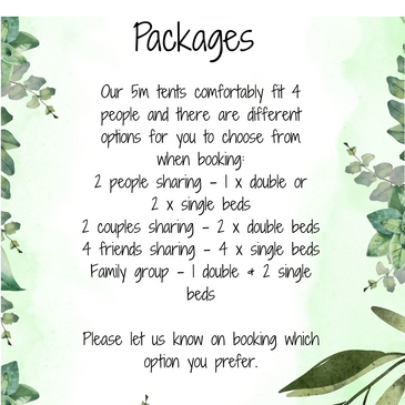 If you choose the fully furnished option for the tents they will come with beds, linen, lighting, tables, seating, flowers and torches as well as other furnishings.